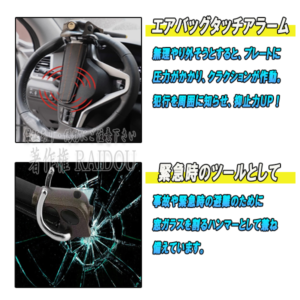 多段ロック式ハンドルロックは、様々な車種のステアリングに確実に固定できる便利な防犯アイテムです。