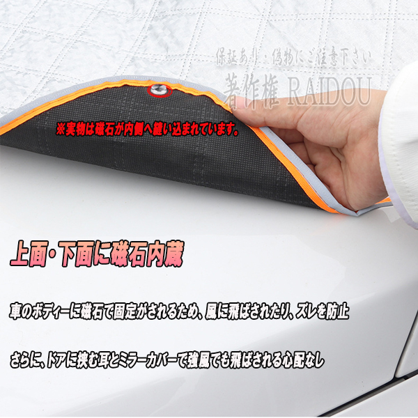 カバーは4層の異なる厚手素材で作られており、耐久性だけでなく、防水や断熱にも優れているため、日焼けによる内装劣化や、積雪や凍結から愛車をしっかり保護できます。