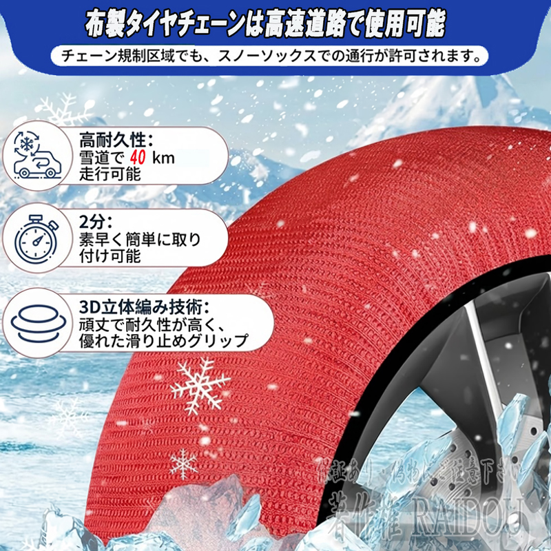 1. 布チェーンは、凍結した道路や雪道での使用に適していますので、雨や雪のない道路や舗装が劣化したアスファルトの上を走行すると、カバーの摩耗が早まります。